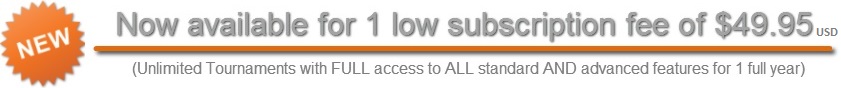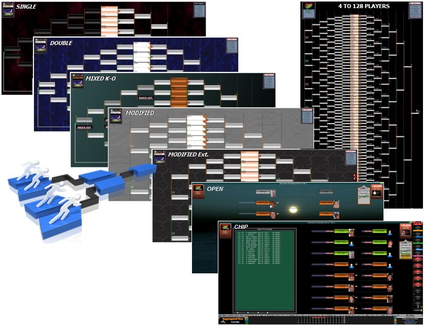 The traditional "Single" & "Double", the "Mixed K-O" which turns a double into a single at a user-selected stage, the "Round-Robin" great for league-play, and the "Modified" (EURO) where a user-selected number of players from the loser-side returns to the winner-side. Recently added are the increasingly popular and entertaining "CHIP" format, and the versatile "OPEN" format to keep track of various match results within a specified time period or session. Check-out our tutorial video section for more detail on these 2 new formats. All formats are fully automated, and supported by numerous hard-copy reports, which greatly simplifies any tourney preparation & management. A Buy-back option is also available on the Double, Miked-KO and Modified.