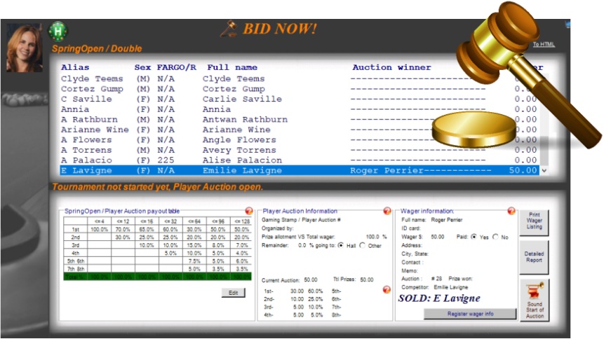 The built-in Calcutta manager provides everything you need to efficiently run an auction. All players are automatically loaded on the Calcutta listing, and the payouts are computed live as the auction progresses. You can specify a percentage going to a beneficiary of your choice, register all bids and bidder info, and print detailed reports of all biddings & winnings.