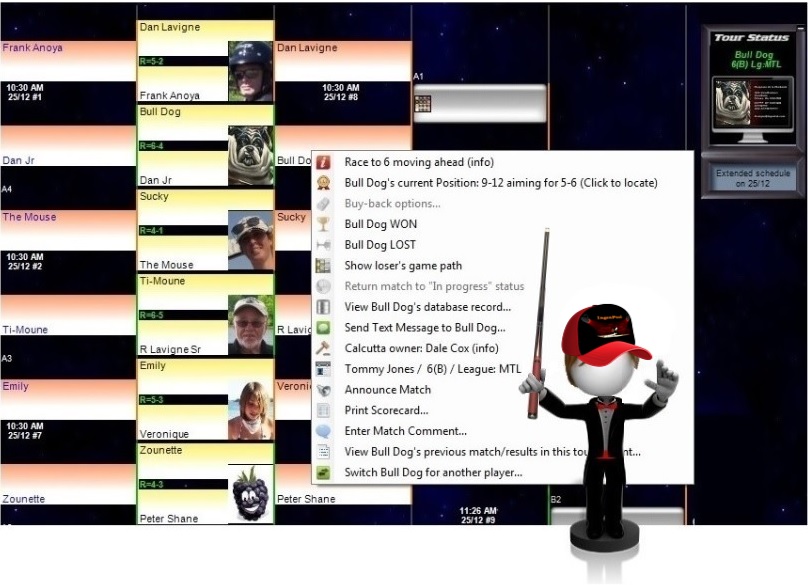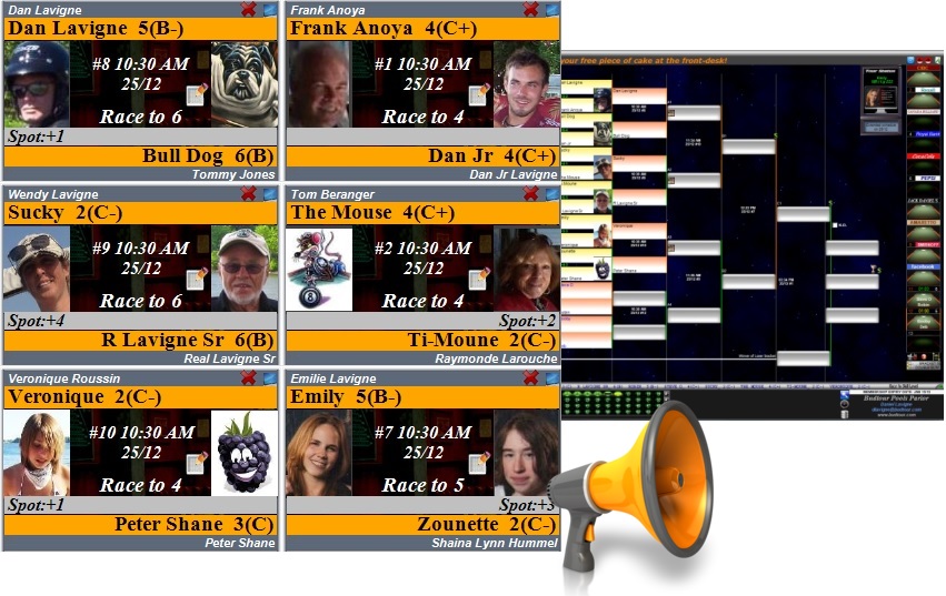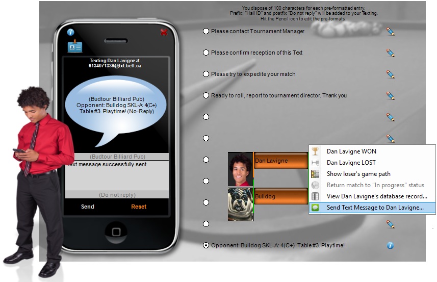 Easily reach your players directly from the main bracket's right-click management menu. Different pre-formatted texts are available, including Table # with opponent's name and skill, so in most case there's no need to type anything! A very professional approach to efficient dispatching, and the peace-of-mind that comes with knowing that your players, wherever they are (most likely at the bar), are only a click away.