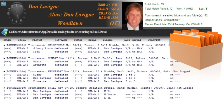 The Player-History provides a compilation of all matches previously played, including opponent name, skills, final scores, points accumulated, money won, final position, time of play, table #, etc. The History is available from the Calcutta & database window, and is extremely useful to evaluate skill level change, and during auctions. As with the "Point compiler", the compilation is performed on user-selected tournament-directory content. It is up to the tournament manager to properly categorize all completed tournaments (season, year, division, etc).