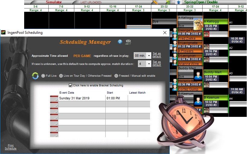 Load the bracket, select a few tables, date & time, handicap & races, and watch IngenPool schedule all matches.