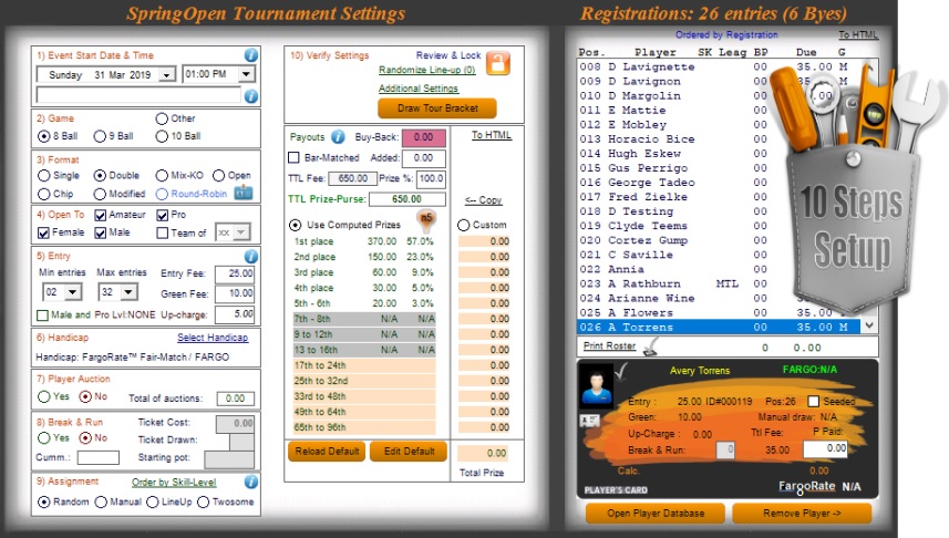 A multitude of options can be turned ON/OFF to fit your management style. This is also where your default payout-table is adjusted for each format. A selection of bracket graphics & backgrounds can be selected, and you may even select your own background image.