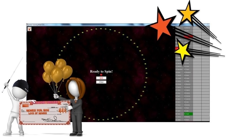 A door-prize spinning wheel is automatically loaded with all registered players, and remains accessible throughout the tourney lifetime. All winners are recorded within the tournament file. When a winner is declared, his name is taken out of the wheel for subsequent spin. You may opt to re-introduce the player.